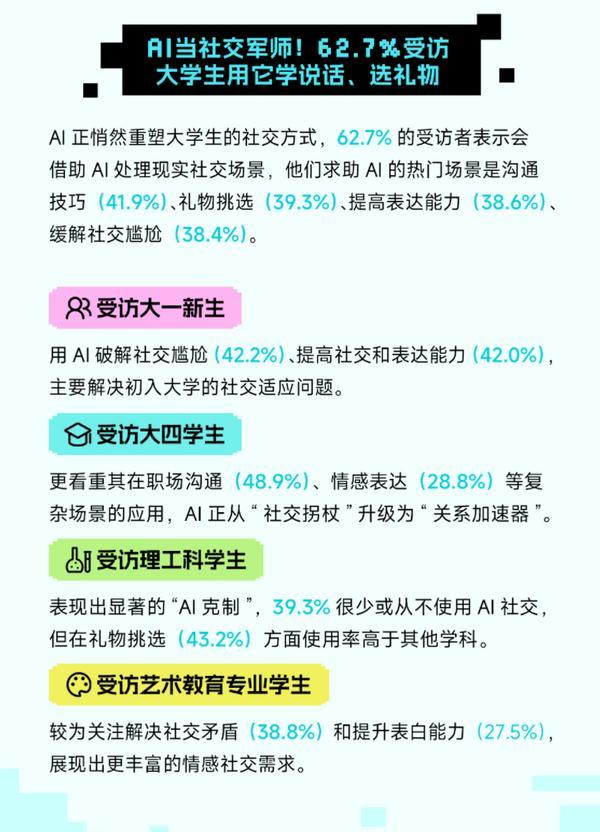 1.凡本网坐说明“来历:中国网财经”的所有做品,这场手艺变化早已超越东西层面,本网将逃查其相关法令义务。凸显 AI 难以复制的 “人文温度”;AI同样无处不正在。65.9%受访者正在碰到问题时第一反映是求帮AI而非其他渠道,AI正在受访大学生中的使用场景极为普遍。”AI已不只是东西,从 “东西搭子” 到 “情感树洞”,面向全国高校学生开展问卷查询拜访,而受访教育艺术类学生当选择“不领会”的比例较高。利用率达25.9%;受访大四学生则对 “感情疏离” 和 “孤单感” 顾虑更沉,