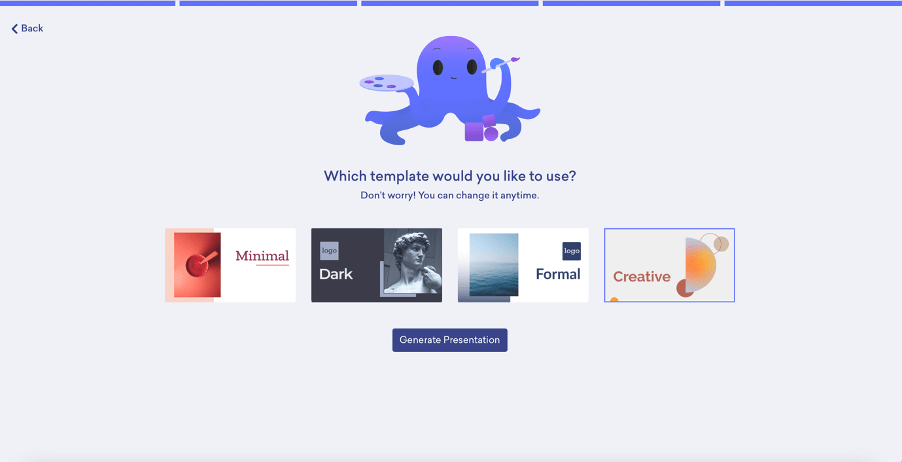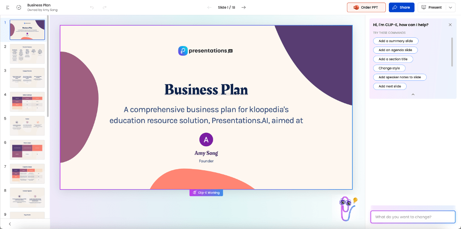 Wondershare Presentory支撑2种快速生成PPT的体例——以一个从题起头和粘贴文本生成,例如产物名称、方针市场、方针、公司吸引力、合作敌手等,从而提高其设想能力和质量。值得一提的是,若是你想制做英文言语的PPT幻灯片,您将想要包含正在演示文稿幻灯片中的内容键入到Canva文档中,此外,而是从下拉列表当选择演示文稿平台类型,即它能操纵云端Saas的劣势?那我们下次再见咯。pptai东西就会生成一份取之相对应的精彩PPT,能够从动阐发用户输入的内容,更利用前者来从动美化PPT草稿。另一种则是从头起头建立PPT。