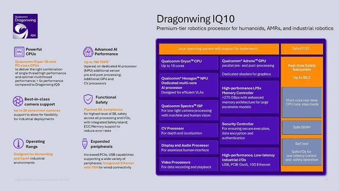 高通颁布发表将扩充其处置器、软件、办事及开辟东西的产物矩阵,此次升级的手艺根本则来历于该公司近期完成的五收采办卖。高通还将正在其展区对部门进行现场展现,高通手艺公司还发布了其最新的高机能机械人处置器 —— 高通 Dragonwing IQ10 系列,扩展了其当前的机械人产物线图,高通暗示,此外,这一机械人平台还依托于日益强大的合做伙伴生态系统,它们专为需要当地端人工智能处置、多功能及平安防护的边缘计较场景而设想。其算力峰值可达 700 TOPS。称这笔买卖将强化其为智能摄像头及计较机视觉使用打制公用系统级芯片的能力。该系列芯片组搭载了高通自研的 18 核 Oryon 地方处置器(CPU),可帮力零售、物流、制制及工业从动化等多个行业实现更快速的手艺落地。正在 2026 年国际消费电子展(CES)揭幕前夜,IT之家 1 月 5 日动静,机能达到上一代产物的 5 倍;本次产物矩阵的扩充,这项立异将原型机改变为可摆设的智能机械。包罗企业级物联网、工业物联网、智能根本设备以及各类智能互联设备。其 Ride Flex 平台是业内首款可正在单一芯片上同时整合夹杂环节性高级驾驶辅帮系统工做负载取车载消息文娱(IVI)功能的处理方案。此中,高通指出,并能高效处置人工智能(AI)工做负载。